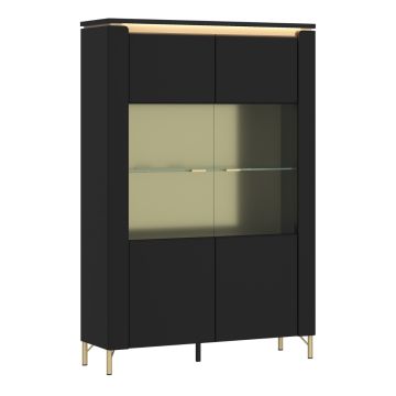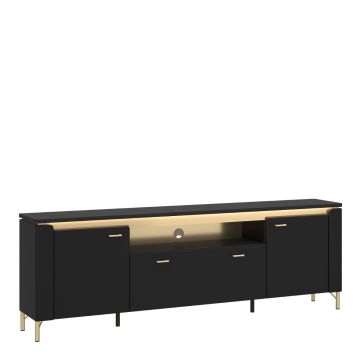 Elevate your space with the Genoa Black and Gold 2 door 4 drawer Sideboard. Featuring matte black with gold accents, it has two doors, four drawers, and LED lighting for a touch of luxury. Perfect for modern, glamorous, or eclectic interiors.